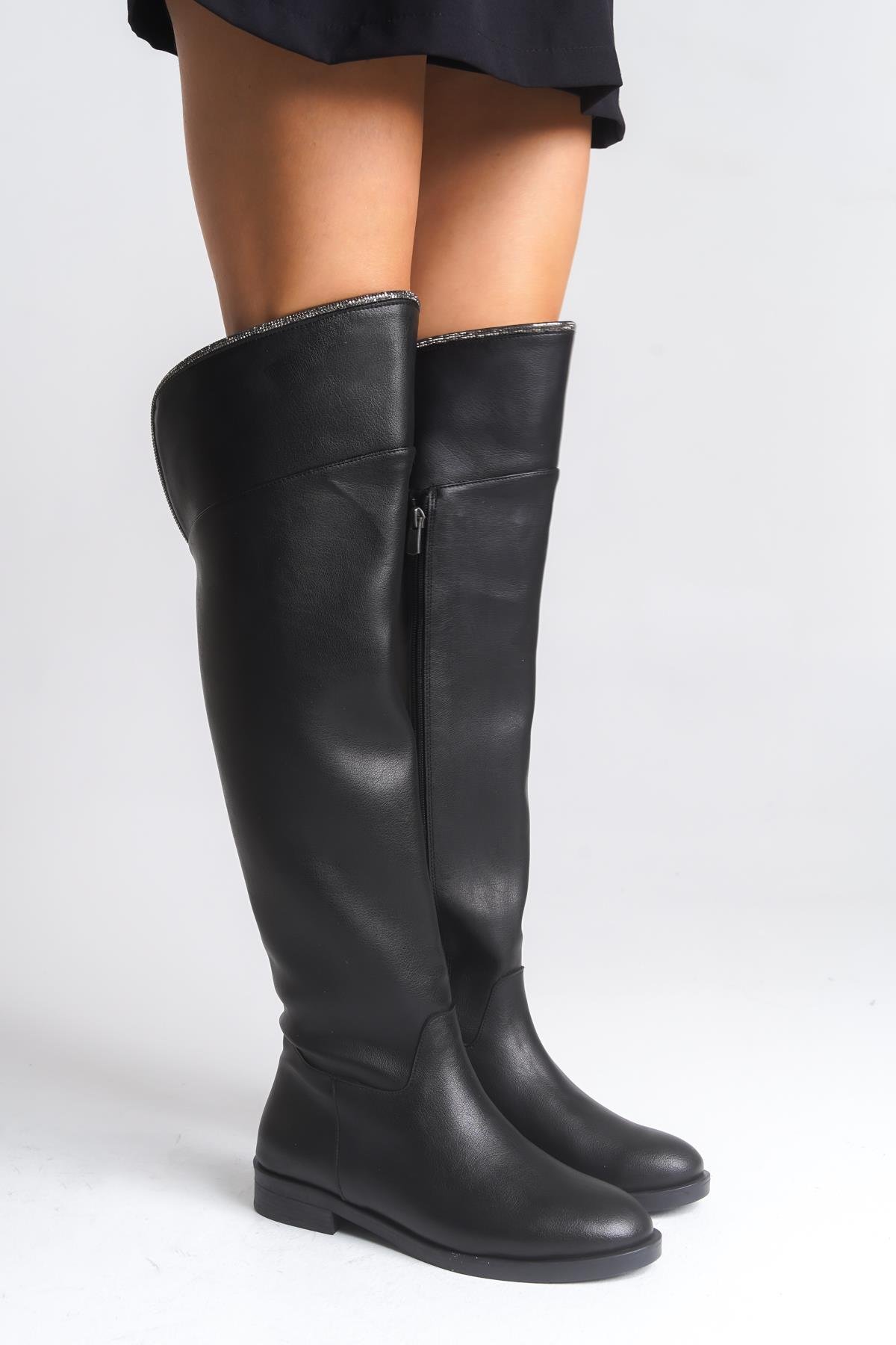 Siyah Deri Binici Diz Üstü Kısa Topuklu Kaymaz Taban Fermuarlı Bihter Kadın Çizme